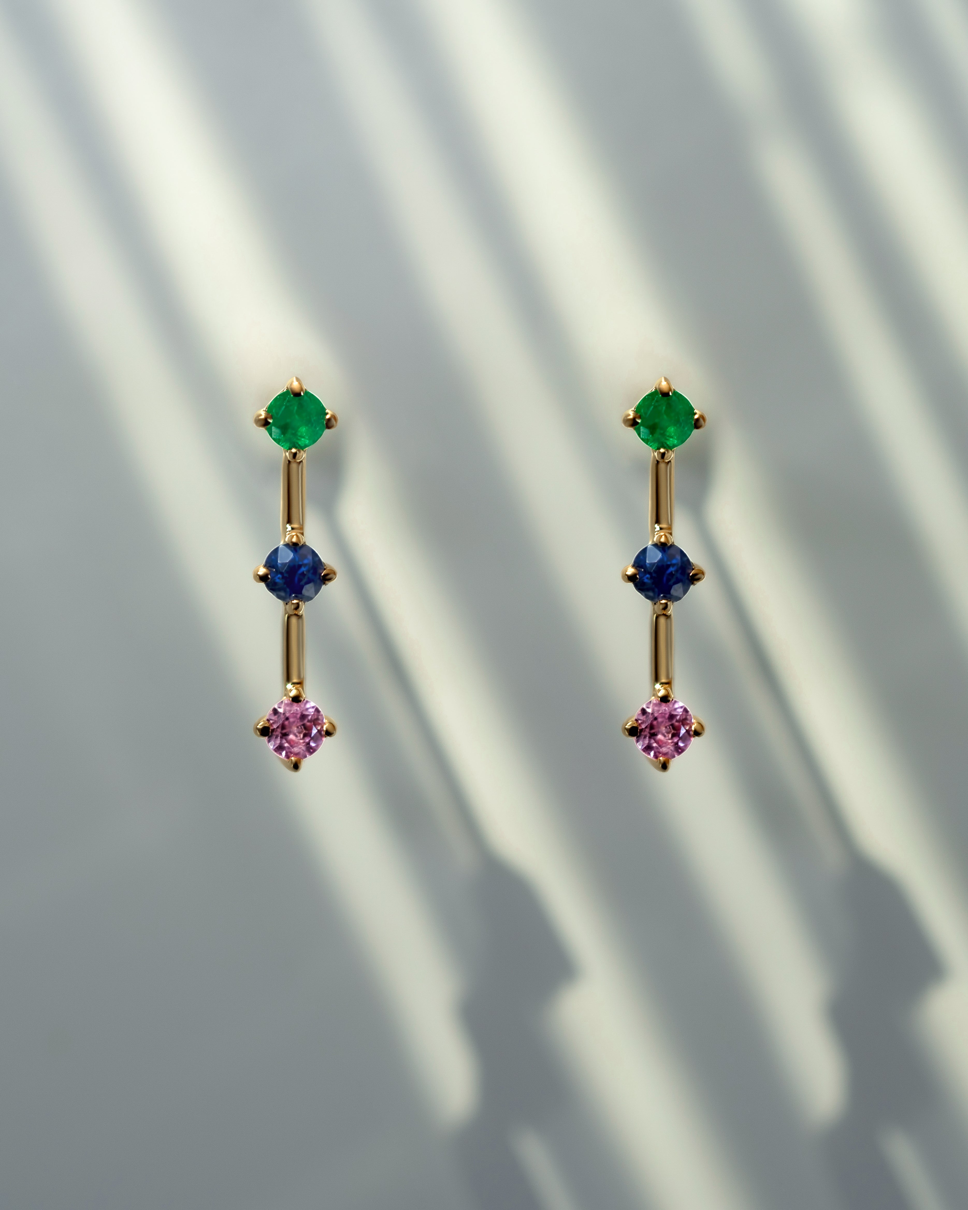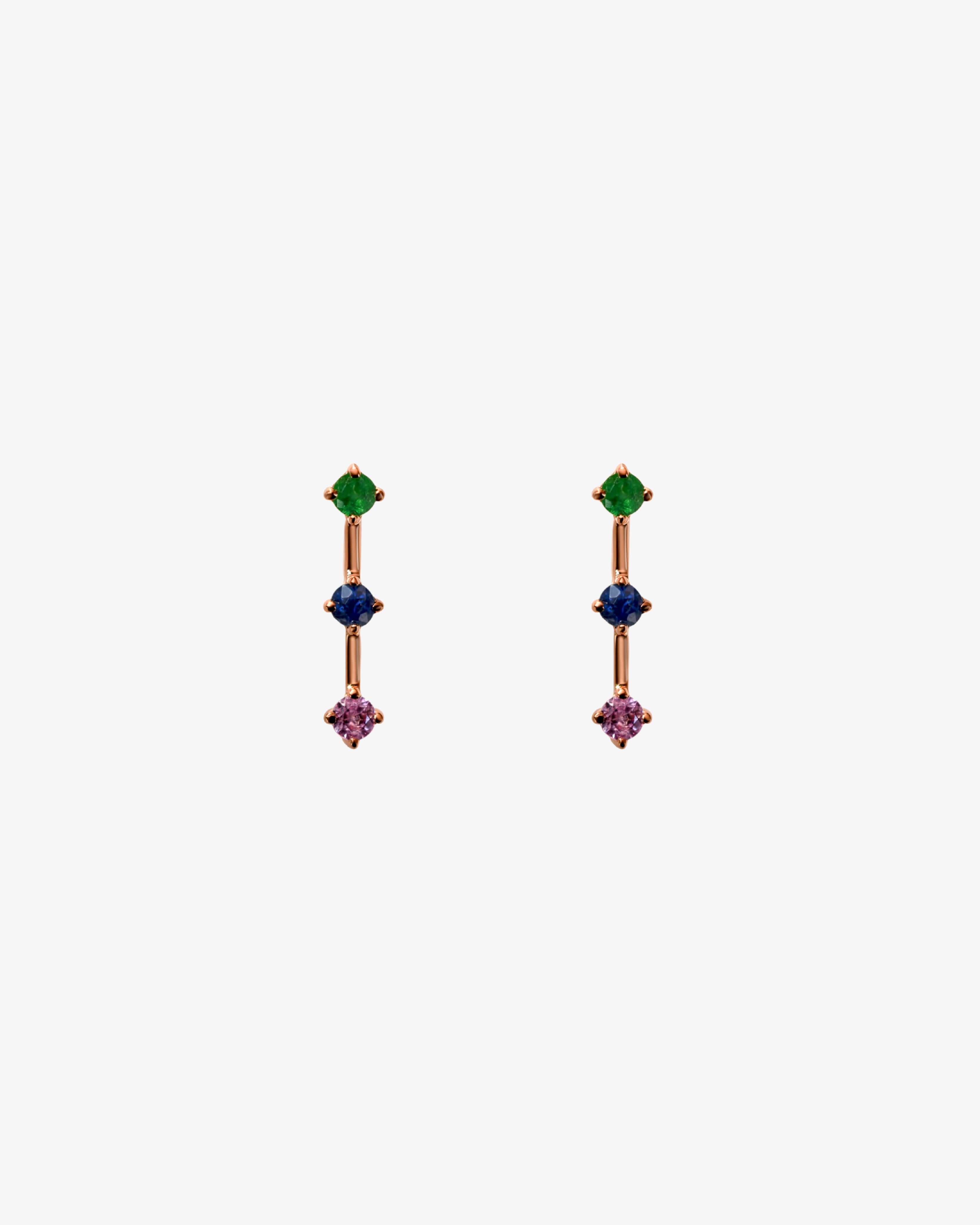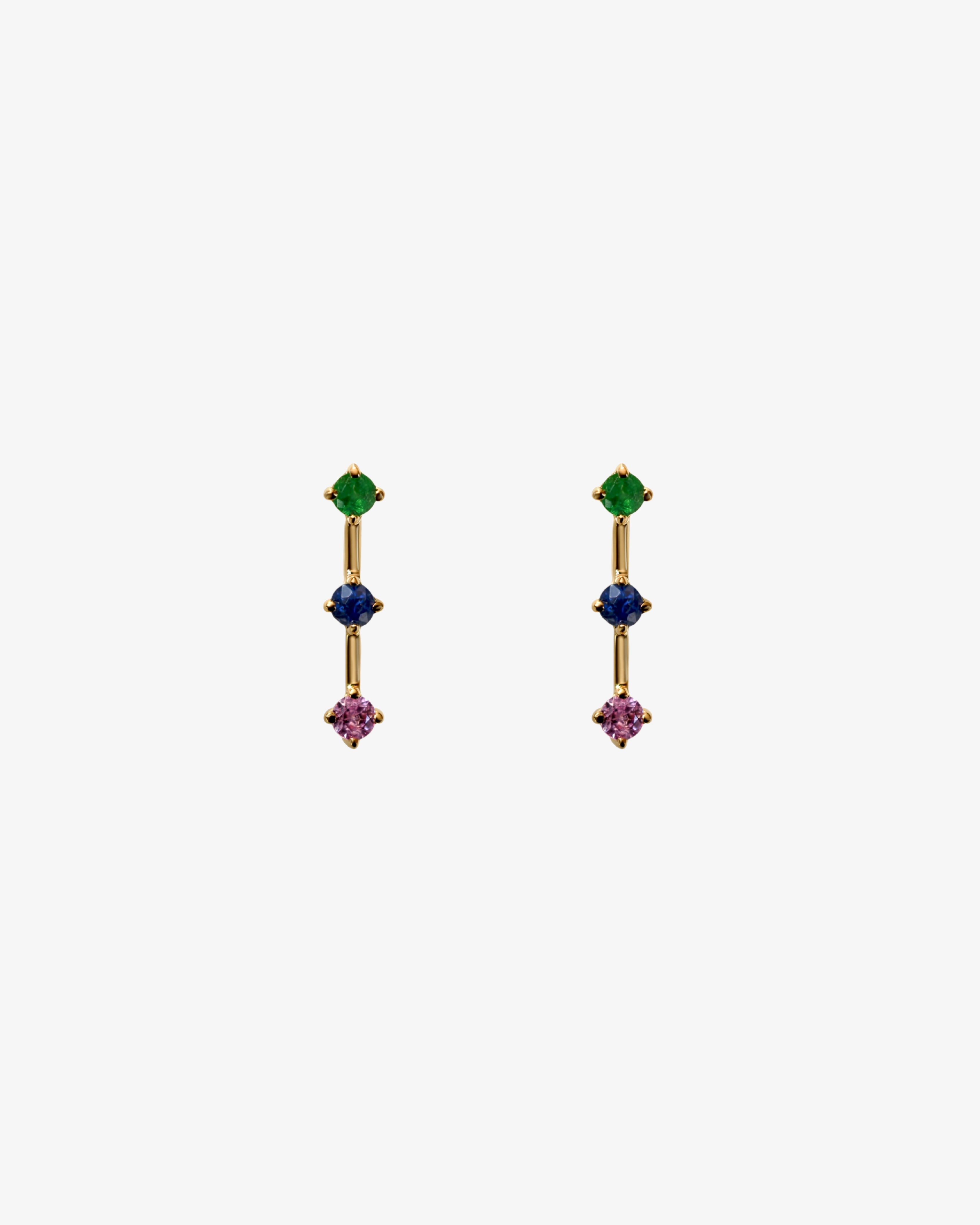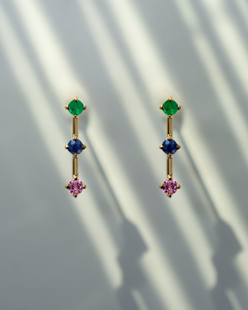 A trio of emerald, deep blue sapphire, and deep pink sapphire set in polished gold. Minimal yet expressive, these earrings bring a playful touch to everyday dressing while staying refined in their simplicity. Crafted with intention and highest quality, joyful in spirit, timeless in form.