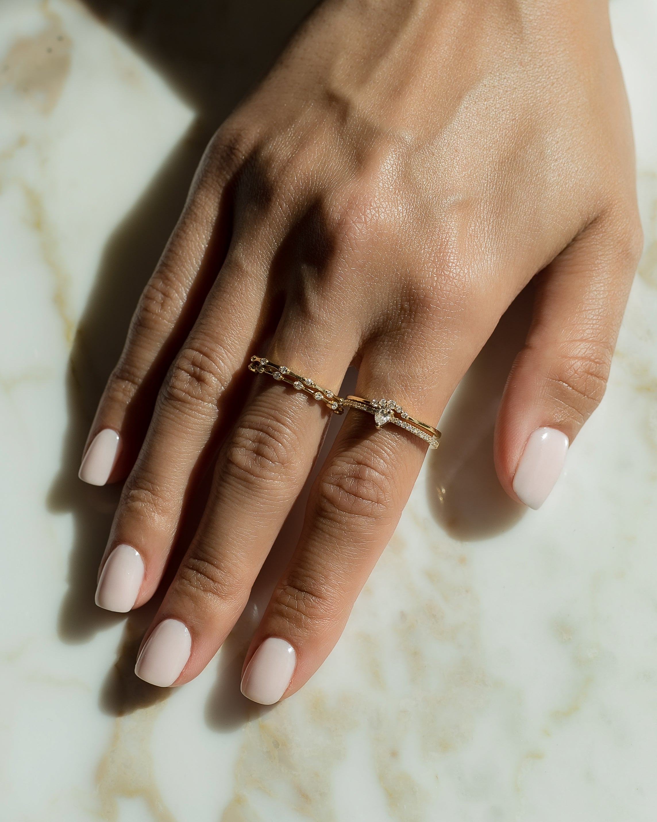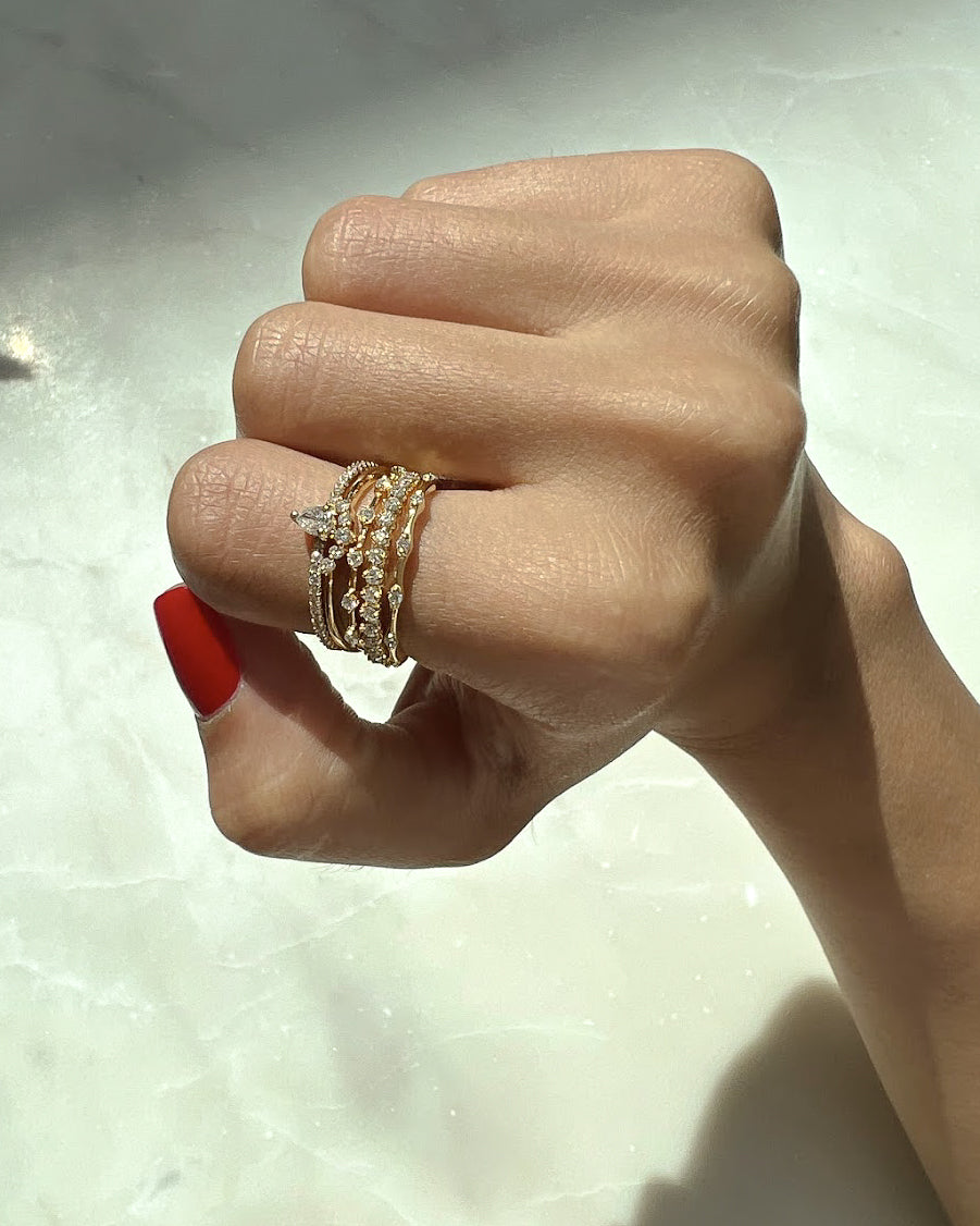 The Pear Diamond Ring features a pear cut natural diamond set on a diamond half eternity band in 18k gold. Balanced in proportion, it is designed to be worn alone or layered, and serves beautifully as a promise ring with timeless meaning.