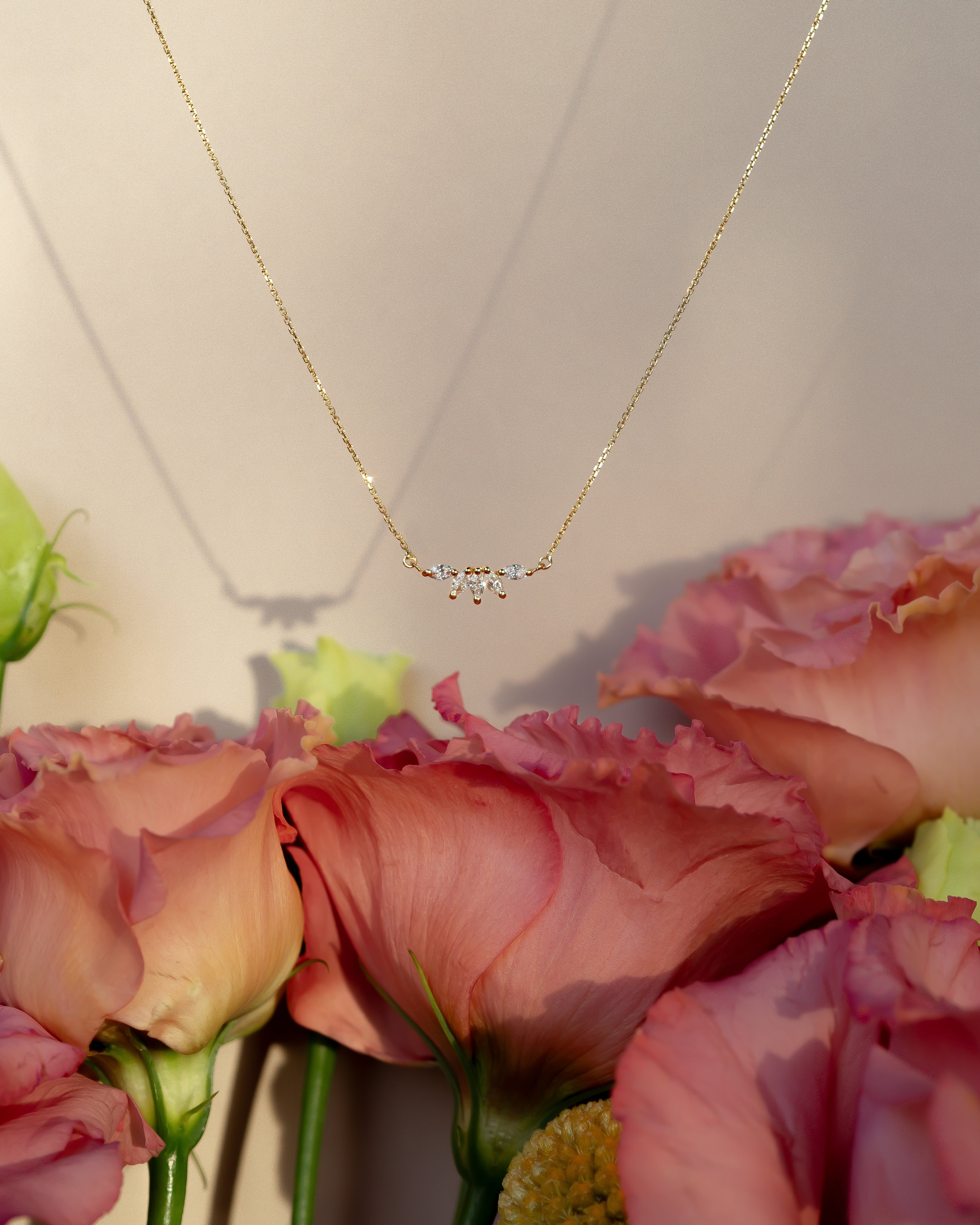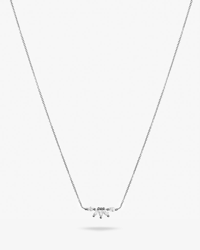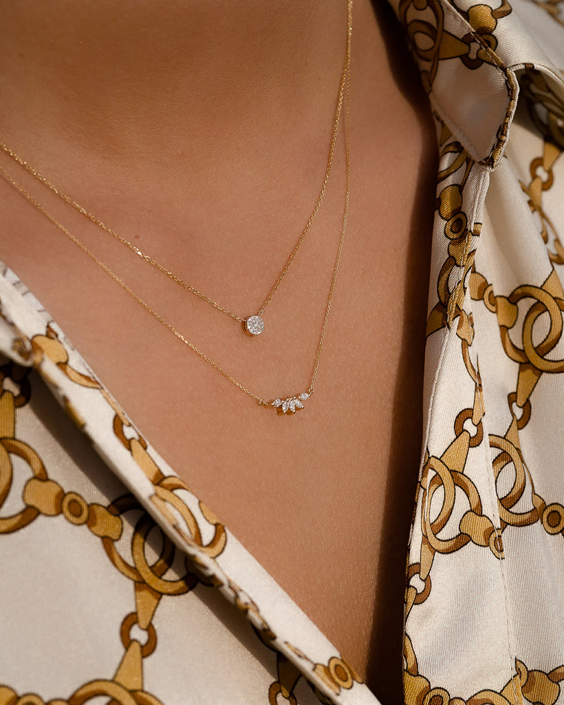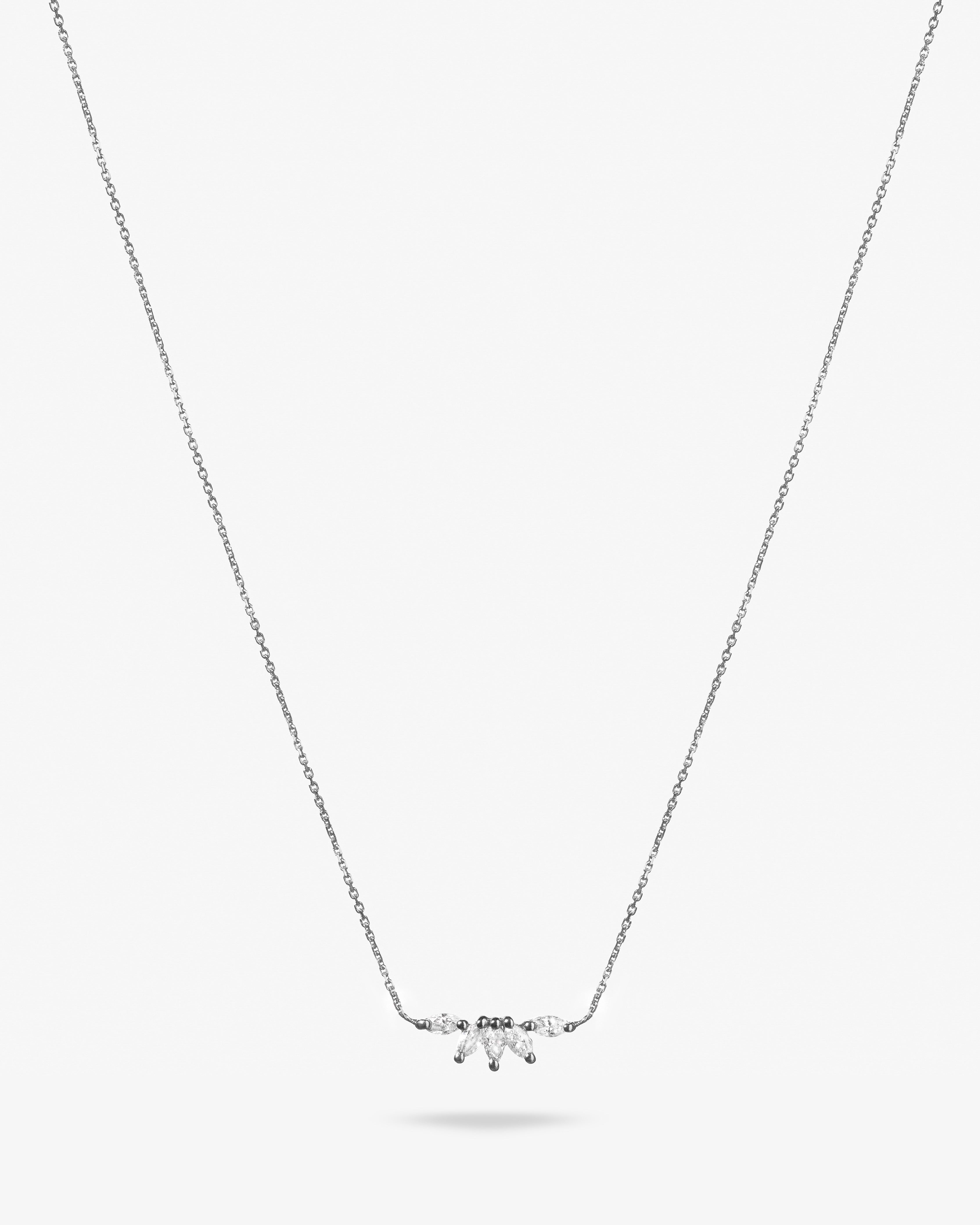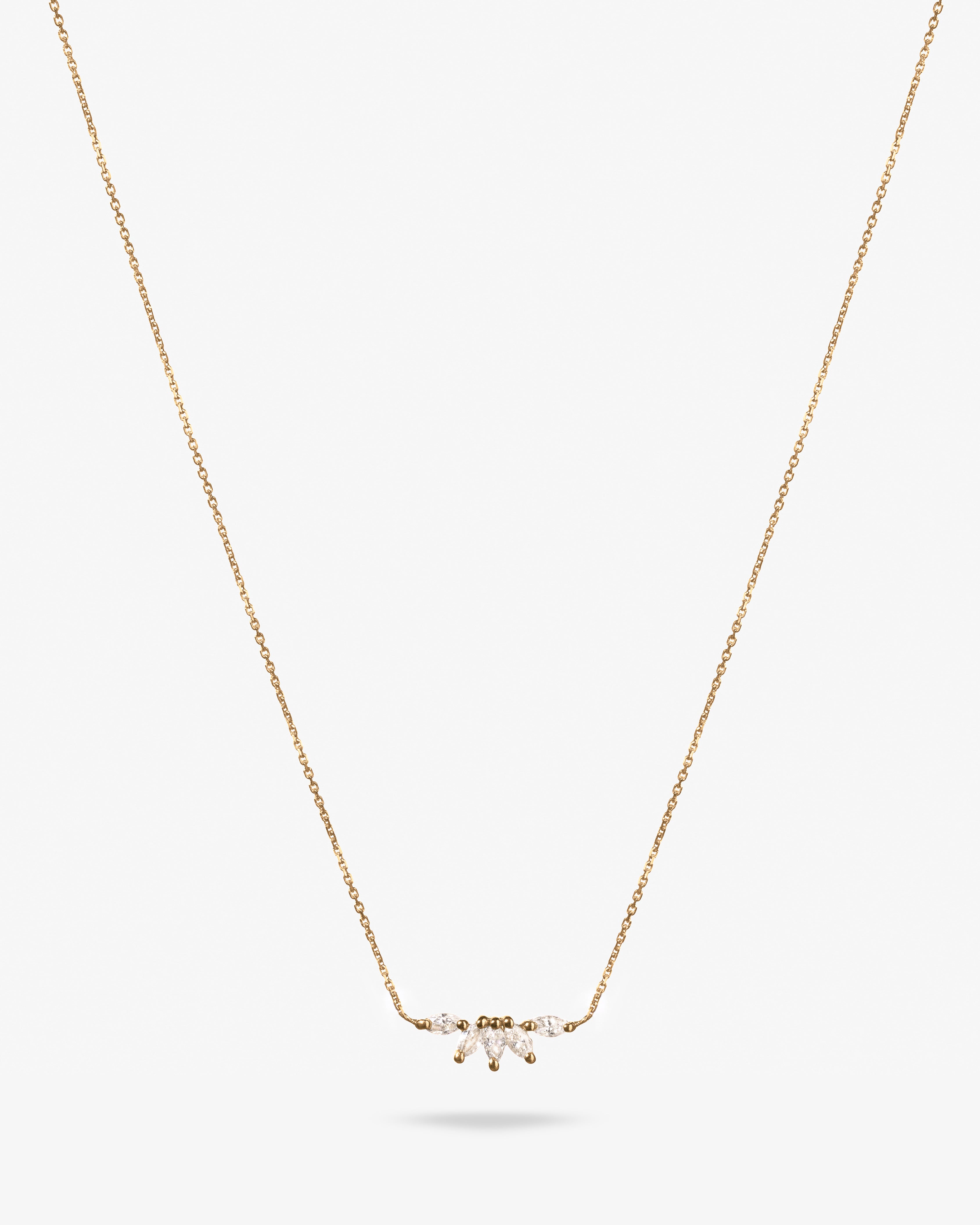 Diamond Sunshine Necklace, inspired by the brilliance of sunlight. Crafted in 18k gold, it features five marquise-cut natural diamonds arranged to reflect the radiance of sun rays.