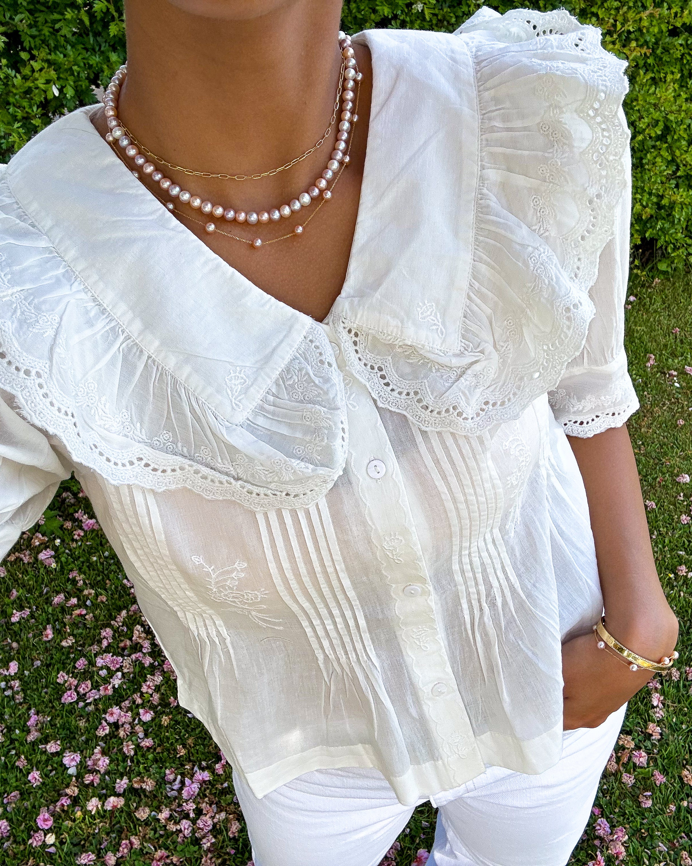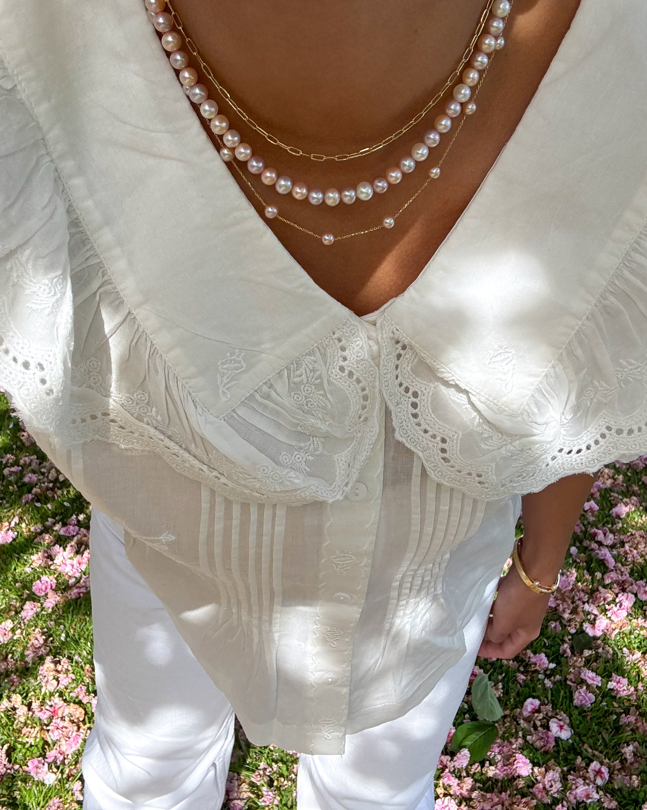 Natural pearls carry slight variations in shape and tone, and these differences are what give the piece its authenticity and timeless charm. Pearls also shine differently in changing light, revealing their own natural luminosity and shifting colour as they reflect their surroundings.
